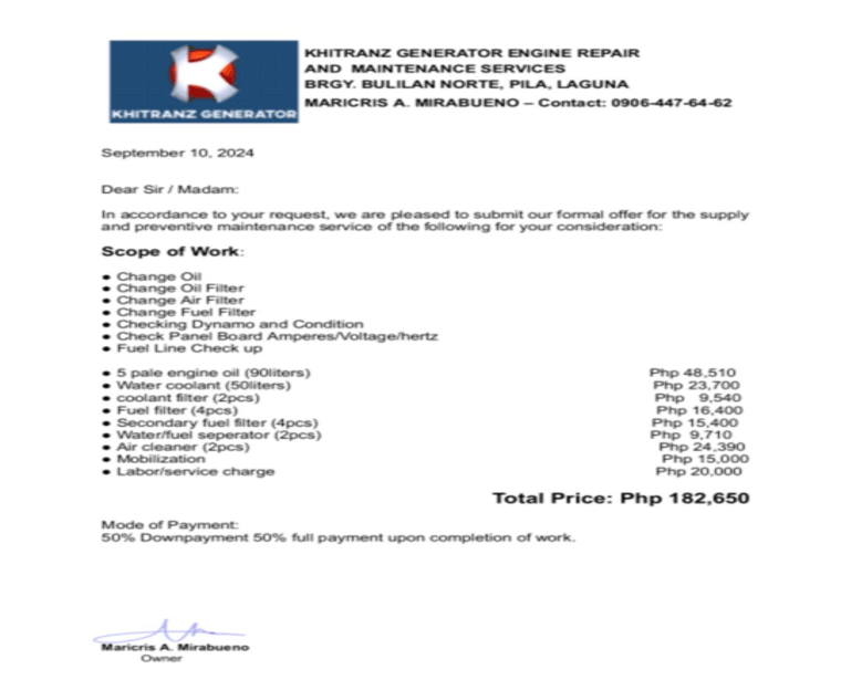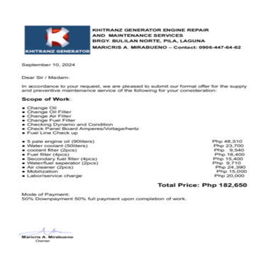Maintaining a generator is important to ensure its readiness whenever needed. However, such task requires budget . For the 2 generator, it requires a Preventive Maintenance Service that helps prevent major issues and extend the life of the generator. Regular PMS ensures optimal performance, safety, and efficiency saving money on costly repairs down the road.